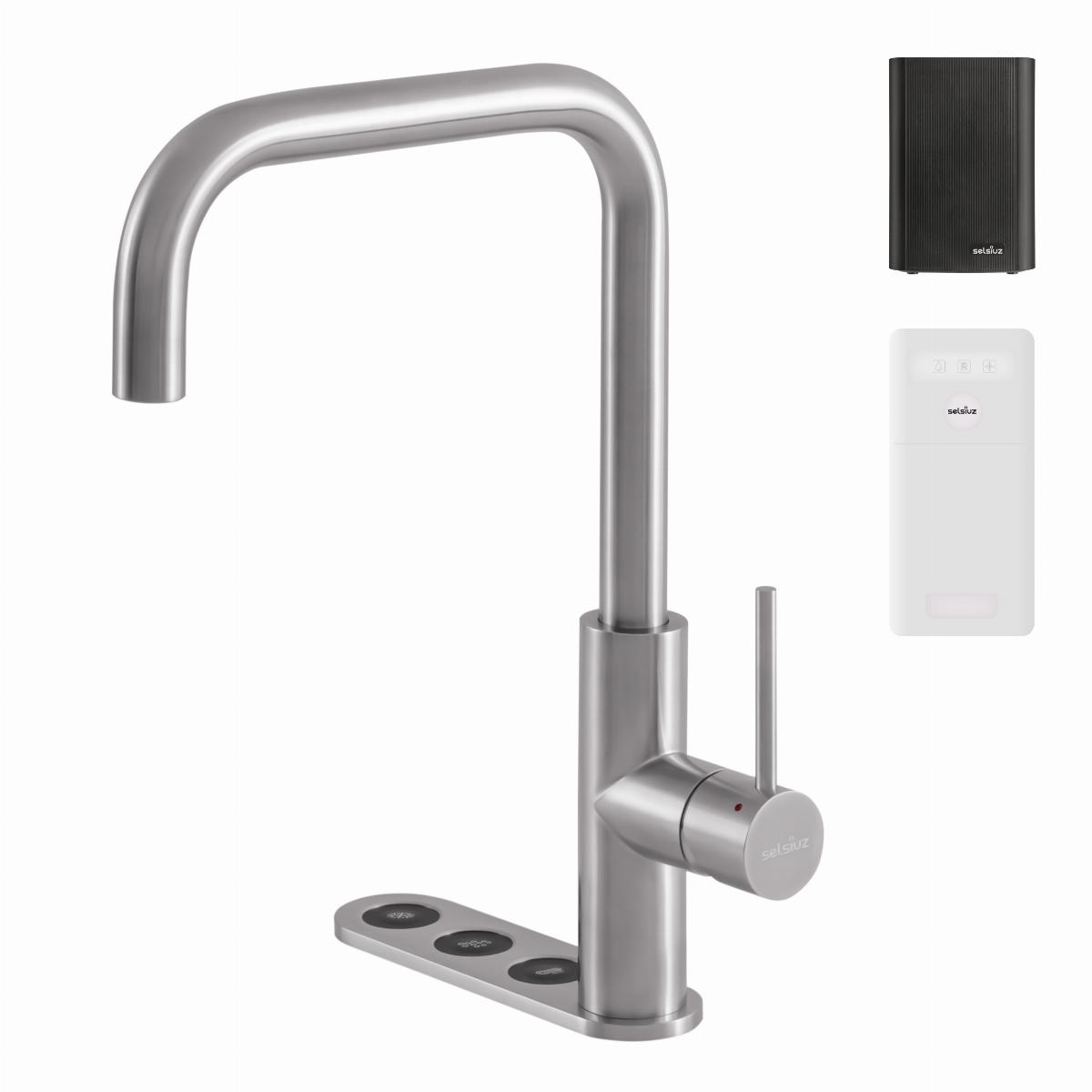 De 5-in-1 Selsiuz Unlimited Haaks geeft koud, warm, gekoeld, bruisend en kokend water. Met de stijlvolle en functionele drukknoppen tapt u veilig kokend water en eenvoudig gekoeld en bruisend water. De rechter hendel bedient het koude en warme water. De kraan wordt geleverd met de Selsiuz Classic boiler en Selsiuz Cooler.