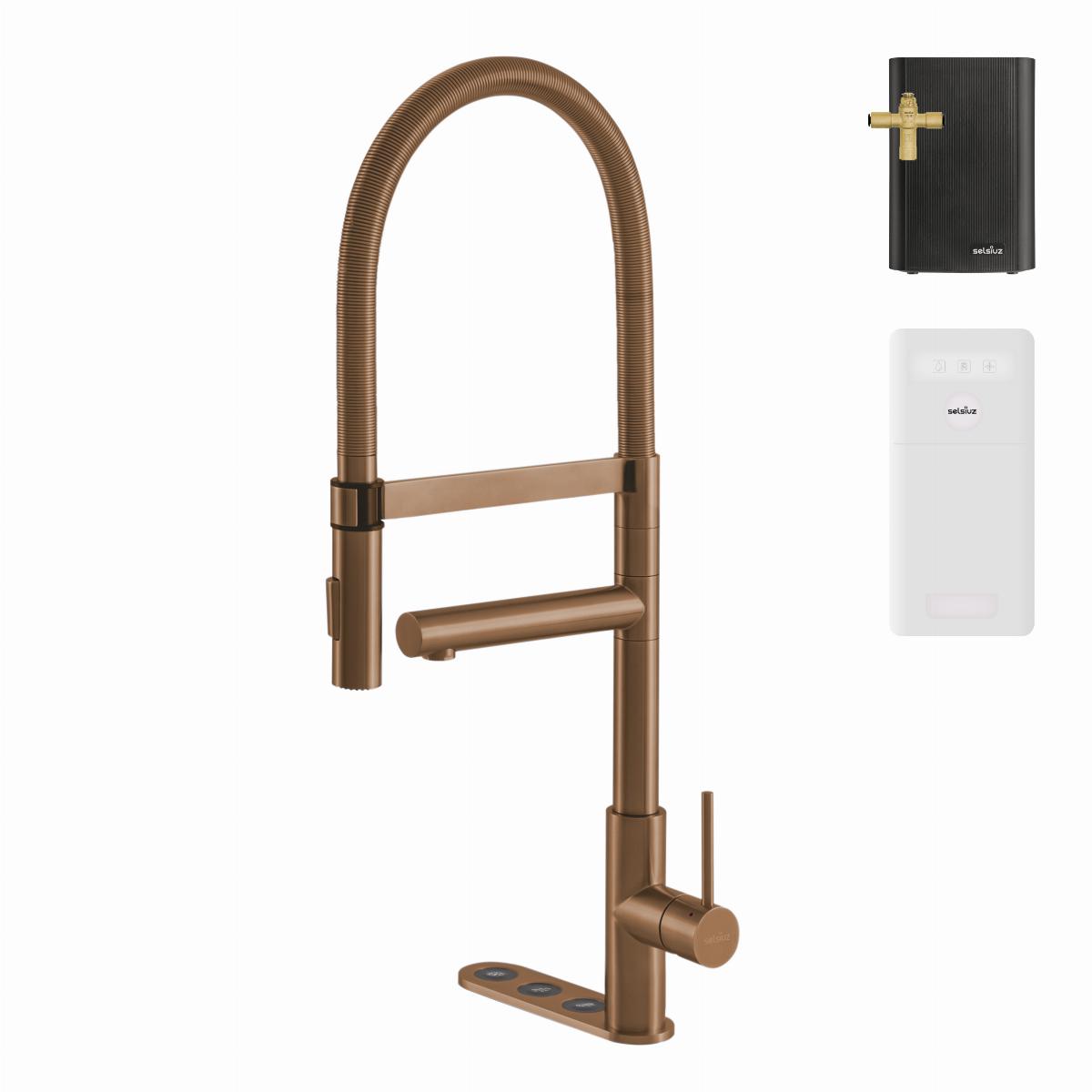 De 5-in-1 Selsiuz Unlimited XL kraan geeft koud, warm, gekoeld, bruisend en kokend water. Met de stijlvolle en functionele drukknoppen op het werkblad tapt u veilig kokend water en eenvoudig gekoeld en bruisend water. De rechter hendel bedient het koude en warme water. De kraan wordt compleet geleverd met de Selsiuz Classic boiler en Selsiuz Cooler.