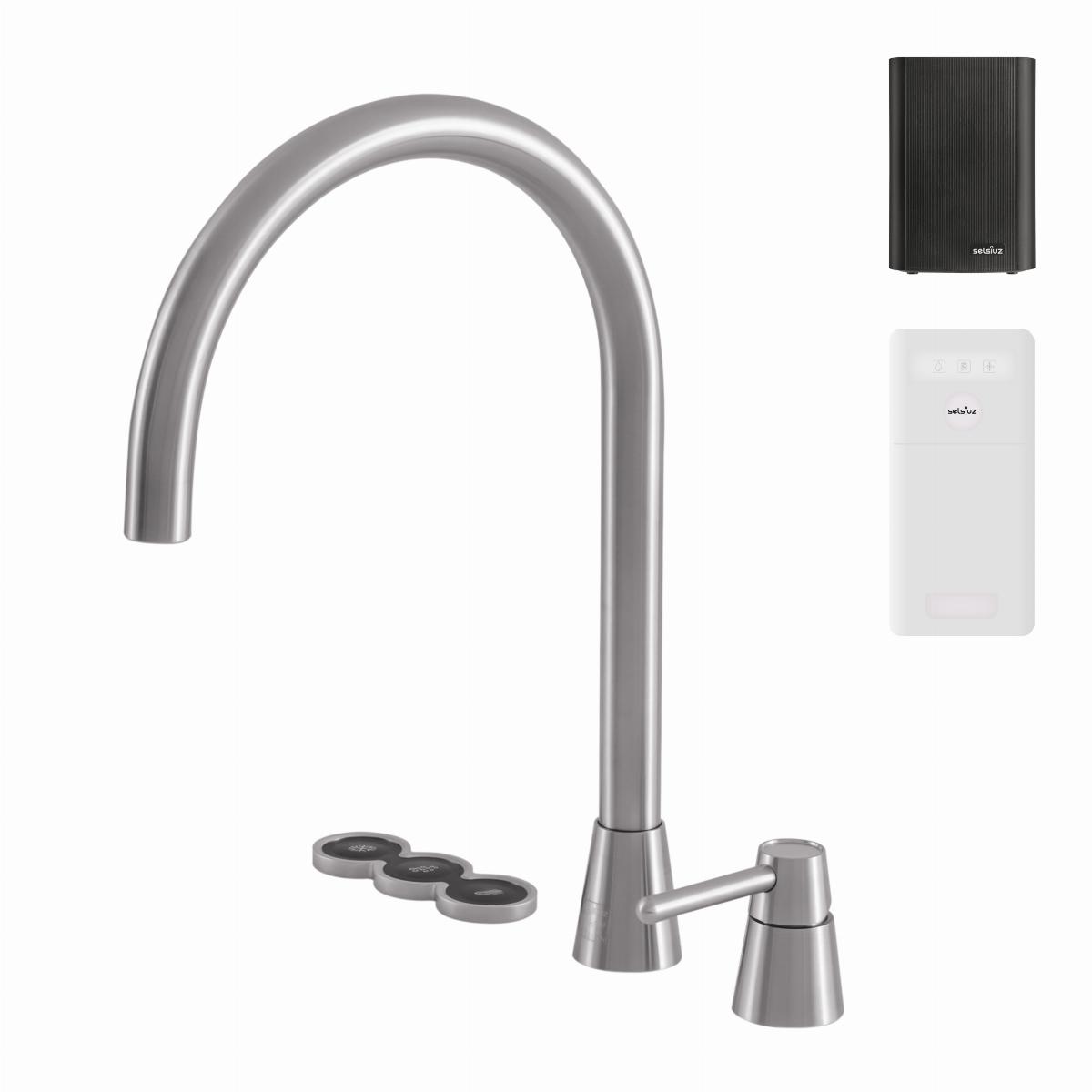De Cone Counter 5-in-1 is een alles-in-één kraan exclusief ontworpen door Osiris Hertman en geeft koud, warm, gekoeld, bruisend en kokend water. De stijlvolle elektronische drukknoppen zijn op het keukenblad gemonteerd. De kraan wordt geleverd met de Selsiuz Classic boiler en Selsiuz Cooler.