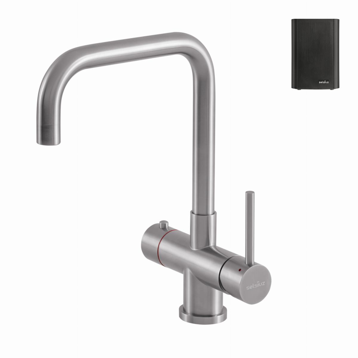 De Push & Turn 3-in-1 Haaks heeft een veilige druk-draai bediening voor kokend water. De rechter hendel geeft koud en warm water. De kraan wordt geleverd met de Selsiuz Classic boiler.
