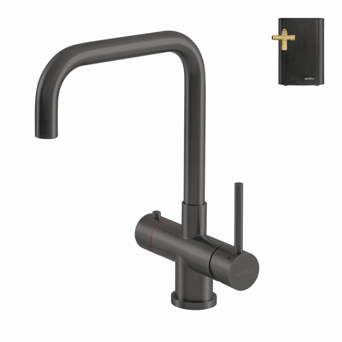De Push & Turn 3-in-1 Haaks heeft een veilige druk-draai bediening voor kokend water. De rechter hendel geeft koud en warm water. De kraan wordt geleverd met de Selsiuz Classic boiler.