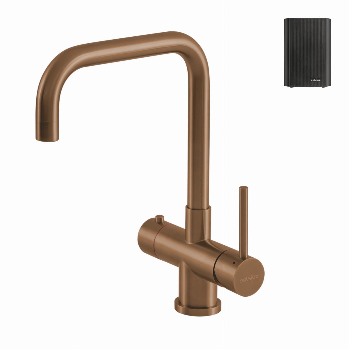 De Push & Turn 3-in-1 Haaks heeft een veilige druk-draai bediening voor kokend water. De rechter hendel geeft koud en warm water. De kraan wordt geleverd met de Selsiuz Classic boiler.